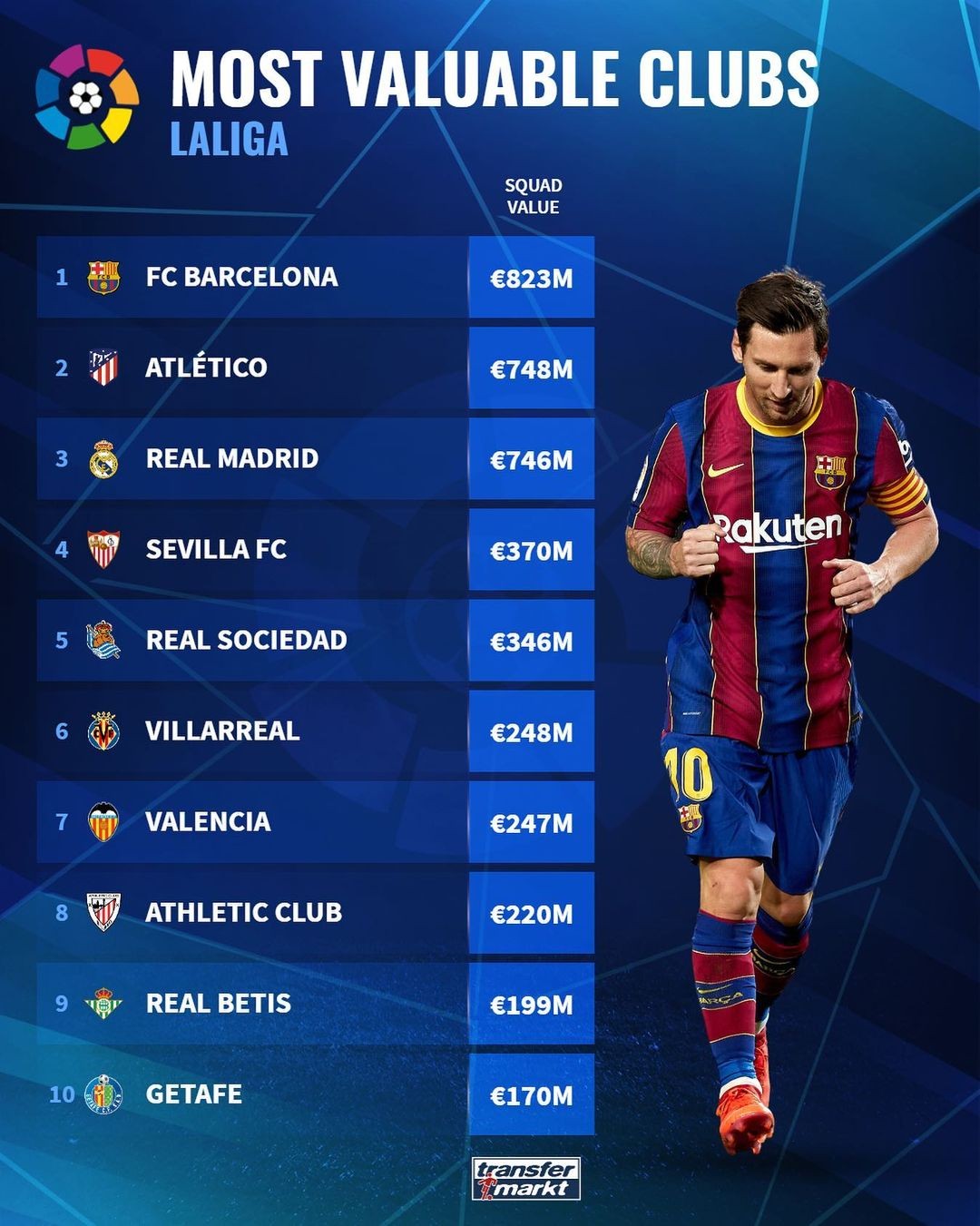 在更新了西甲球员的身价后,德国转会市场网站统计出了西甲球队最新的身价排行榜,其中,巴萨以8.23亿欧位居榜首,马德里双雄马竞和皇马紧随其后。