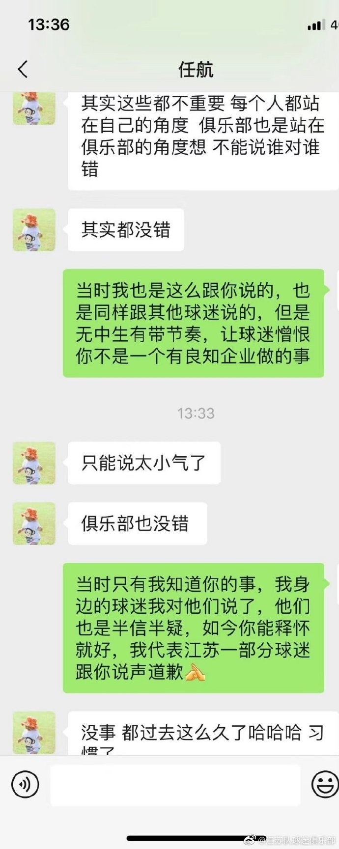 该博主介绍,2016年,苏宁接手舜天后,和合同临期球员开始谈续约,当时任航提出,加薪续约,苏宁方面表示同意。后,并没有任何跟进,也没有给任航任何谈判空间,时间和余地。合同临近日期的时候,任航再次找俱乐部相关负责人,加薪续约,未得到任何回应。此时,外界舆论开始有风声说,俱乐部开出千万年薪续约任航,任航方面不同意,再之后,俱乐部方面放出风声,说任航所要巨额续约签字费6000万。根据球员说法,苏宁给出的条件远低于700万球员心里预期,顾导致最终没有续约。