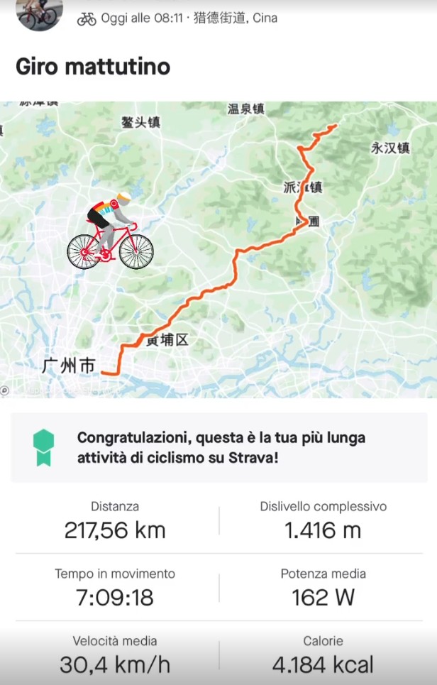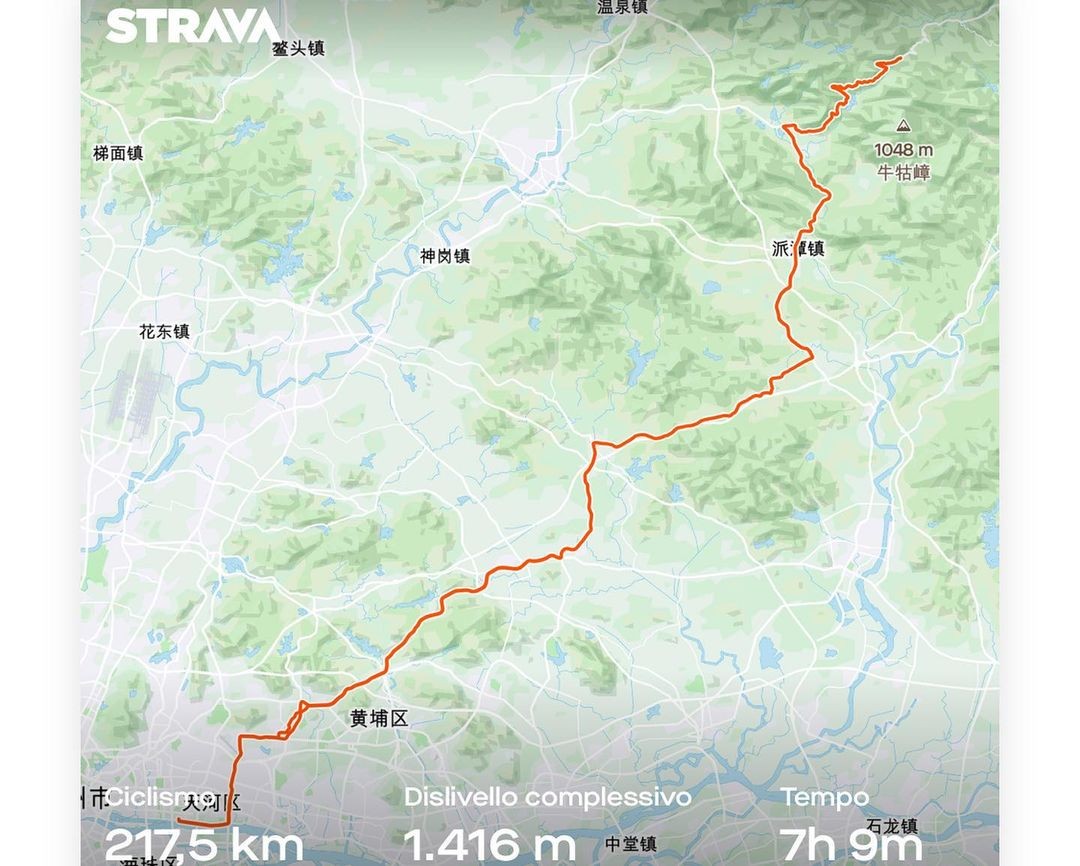 照片中可以看出,他和几位友人从广州天河区出发,骑行了长达217公里,骑行时长超过7个小时,配速约为30公里每小时,最终抵达惠州市南昆山附近。