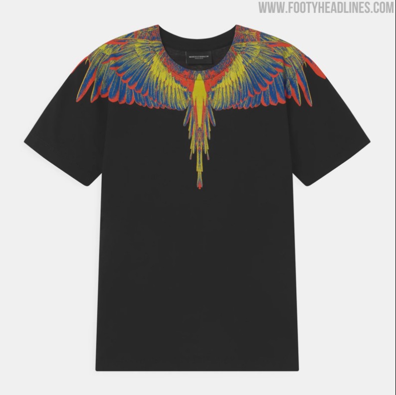而在整件球衣上,最能吸引眼球的想必便是位于球衣胸前的鸟儿翅膀图案了,这也是来源于Marcelo Burlon的经典设计。蓝色、青色的巨大鸟儿翅膀落在球衣的双肩,给整件衣服增色不少。