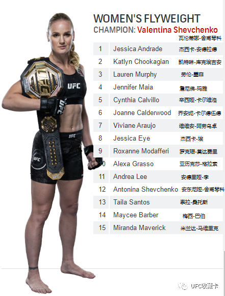 本周女子蝇量级排名无变化。最近许多其他量级的选手选择来到125磅试水,使得原本死气沉沉的量级渐渐焕发活力。从草量级而来的几位选手都取得不错成果,尤其是安德拉德已经赢得了在本周挑战冠军的权利。据最新消息已经长期休战移除排名的“女版小鹰”苏亚雷斯也将选择今年夏天在蝇量级回归。