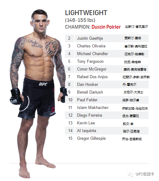 本周轻量级排名不变。配图的错误依然没有调好,目前轻量级冠军头衔空缺,新冠军将会在UFC 262上由现排名第3的奥利维拉和第4的钱德勒决出。一周最大的新闻无疑为“钻石”普瓦里尔和“嘴炮”康纳的三番战合约终于正式敲定,将于7月10日举行。另外现排名第12的费雷拉与第15的吉莱斯皮的比赛也在本周配对成功,将在5月8日对决。
