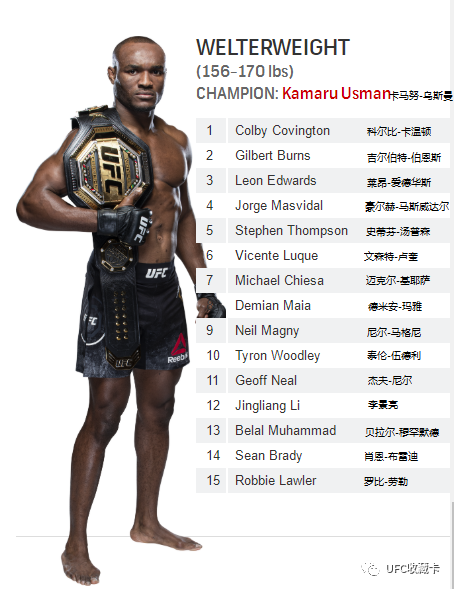 本周次中量级榜单无变化。本周末的UFC 261头条主赛将会上演冠军头衔战:“尼日利亚噩梦”乌斯曼与“街头耶稣”马斯维达尔的二番战。希望这次充足时间备战的小马哥可以避免被再次修脚的厄运。- -