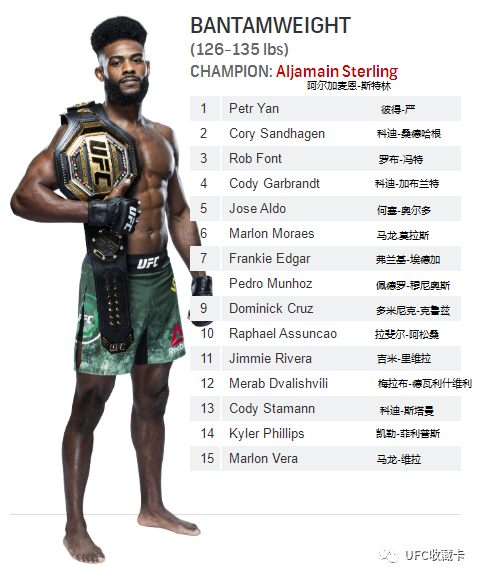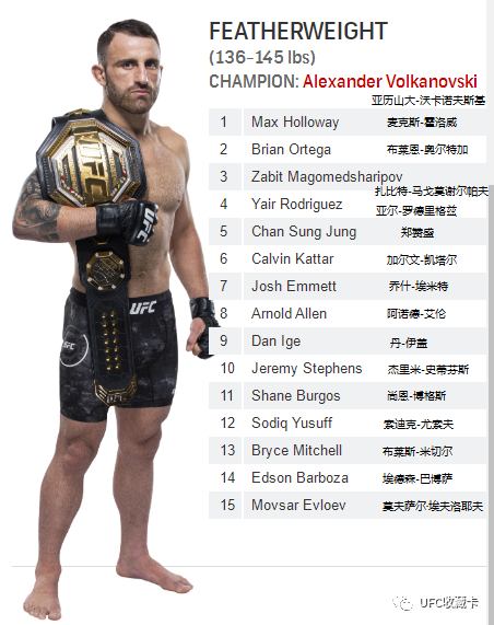 本周羽量级排名无变化。由于现冠军“大帝”沃尔诺夫斯基深受新冠疫情困扰,羽量级陷入了停滞的危机,唯一的好消息算是“大帝”应该距离痊愈不远了,在上周末的比赛中正式确认即将和原本的冠军挑战者奥尔特加一起参与第29季的“终极斗士”录制,本季的真人秀将设置中量级和雏量级两个量级。
