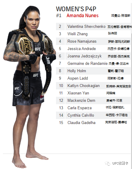 本周女子P4P没有变化。不过即将在本周举行的UFC 261将有2场P4P高排位选手的捉对厮杀。中国格斗迷最关心的张伟丽将接受目前P4P第4的“暴徒玫瑰”罗斯的挑战。而P4P榜眼“子弹”舍普琴科将面对P4P第5的安德拉德冲击。