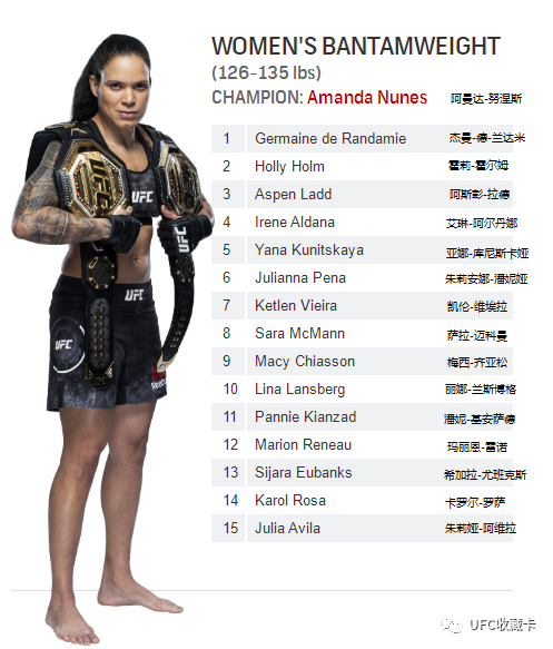本周女子雏量级名单没有变化。这周内最大的新闻莫过于冠军头衔战官宣达成,现排名第6的潘妮娜在孜孜不倦的短信轰炸下终于赢得了越级挑战努涅斯的机会,比赛将在8月7日的UFC 265上举行。