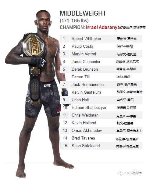 本周中量级榜单没有变化。上周“五星哥”惠特克成功保住量级排名第一并终于喊话挑战“黑龙”阿迪萨亚。可在UFC主席白大拿近期接受雅虎记者采访中提到,惠特克对冠军战的渴望程度在他看来依然不是很足,在主席心中似乎来自意大利的维托里对冠军战的欲望更强。另外本周的比赛将会上演一场排名内的老将之战由现第11位的“美国队长”魏德曼挑战第9位的“黄金时间”霍尔。