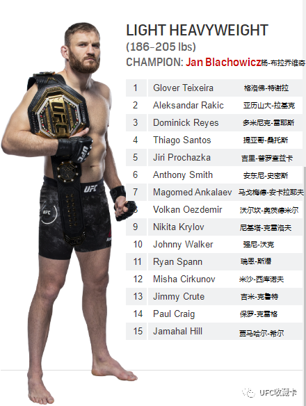 轻重量级榜单没有变化。本周最近爆的配对非下一场冠军头衔战终于官宣!卫冕冠军扬.布拉乔维奇将在9月举行的UFC 266中接受已经42岁高龄的特谢拉的挑战。目光重回本周,现排名第6的“狮心王”史密斯将迎战现排名第13的“澳洲野兽”克鲁特。