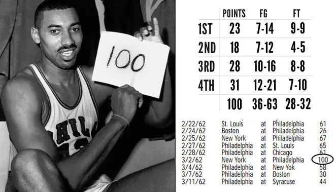 1962年3月2日,费城勇士以169-147击败纽约尼克斯,这场在宾夕法尼亚州偏远小镇举行的比赛还诞生了一个令后人望尘莫及的篮球纪录,威尔特-张伯伦在这场比赛打满全场,总共63投36中,罚球线上也一反常态地投出32中28的准度,全场拿下100分。