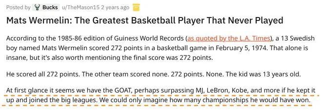 但不论如何,如果纪录属实,这名小男孩就是世界纪录的保持者。Reddit甚至有网友开玩笑的讨论,如果当时马特斯-维尔姆林能够继续钻研篮球,加入NBA,那么他可能会成为毫无争议的GOAT(历史最佳)。
