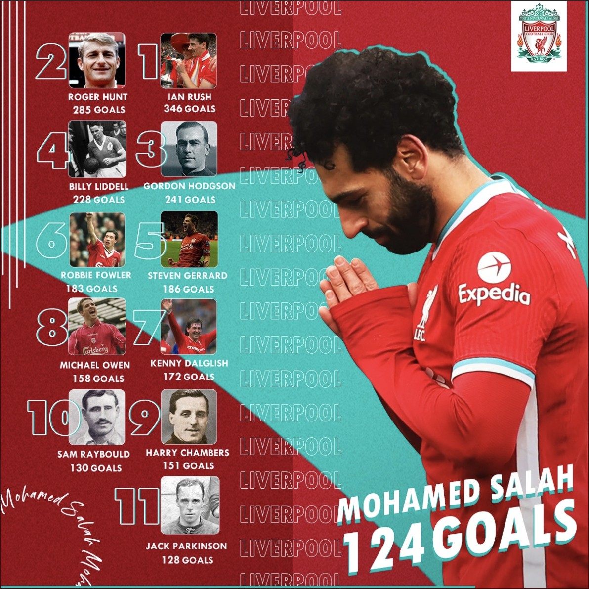 2017年加盟利物浦以来,萨拉赫已经为球队打进了124粒进球。在俱乐部历史射手榜上,萨拉赫上升至第12位。