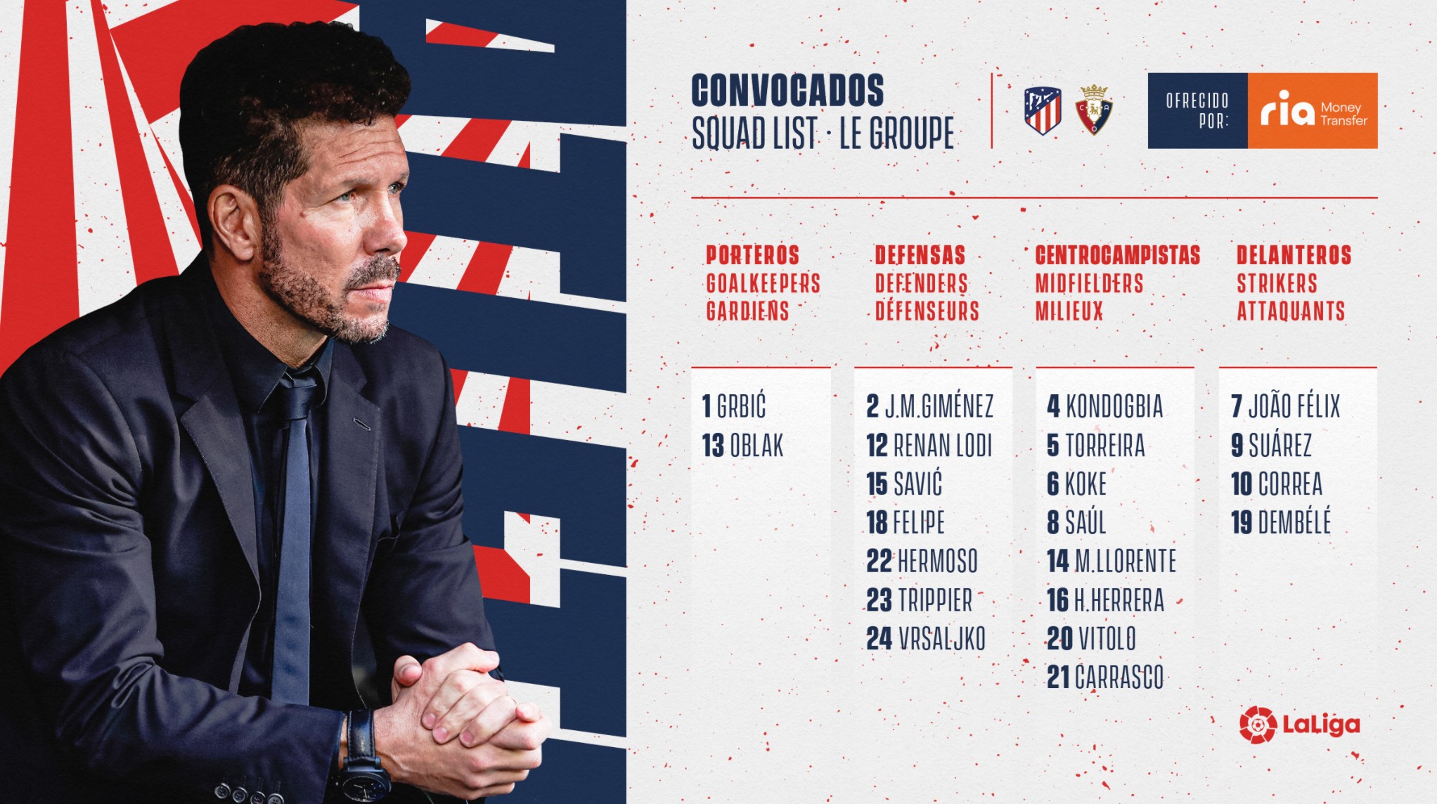 北京时间5月17日凌晨,西甲第37轮,马竞将主场对阵奥萨苏纳,赛前,马竞公布球队此役大名单,苏亚雷斯领衔,勒马尔继续伤缺。