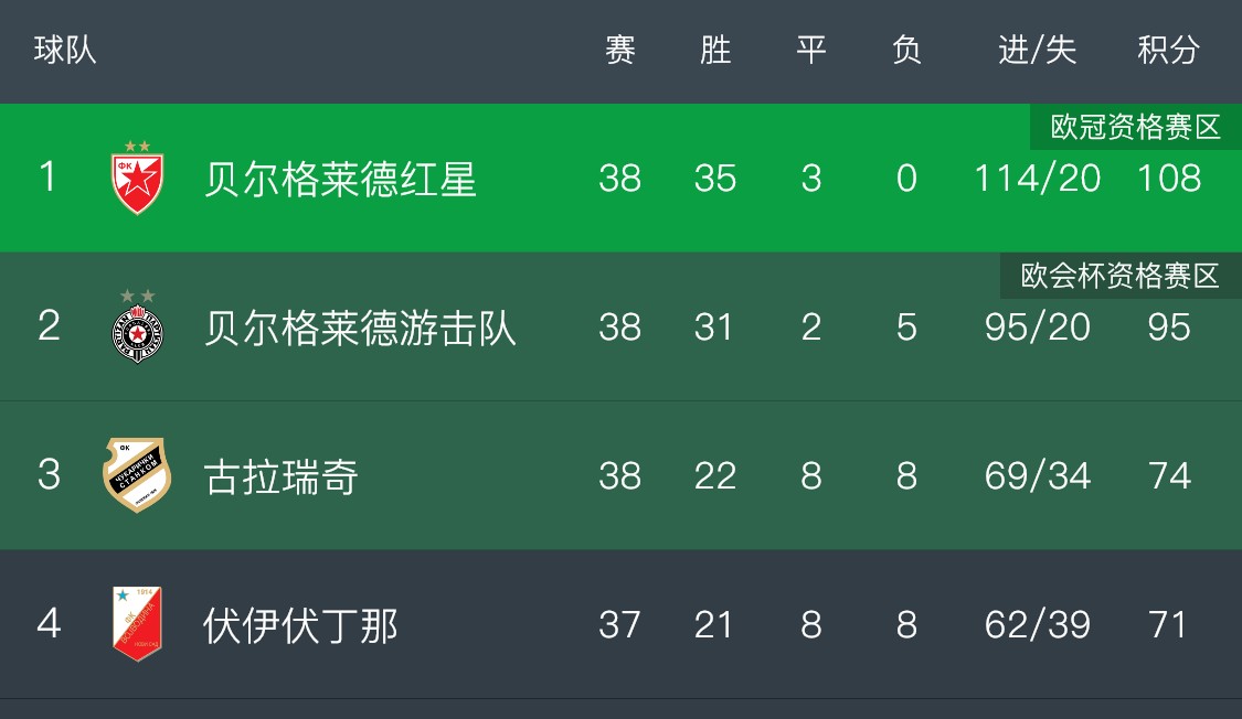 5-1大胜梅塔拉克后,贝尔格莱德红星以35胜3平的不败战绩结束本赛季联赛,拿到了108分,拉齐奥、国米名宿斯坦科维奇带领的这支塞尔维亚豪门打破了由凯尔特人在2016/17赛季的创下的106分世界单赛季积分纪录。