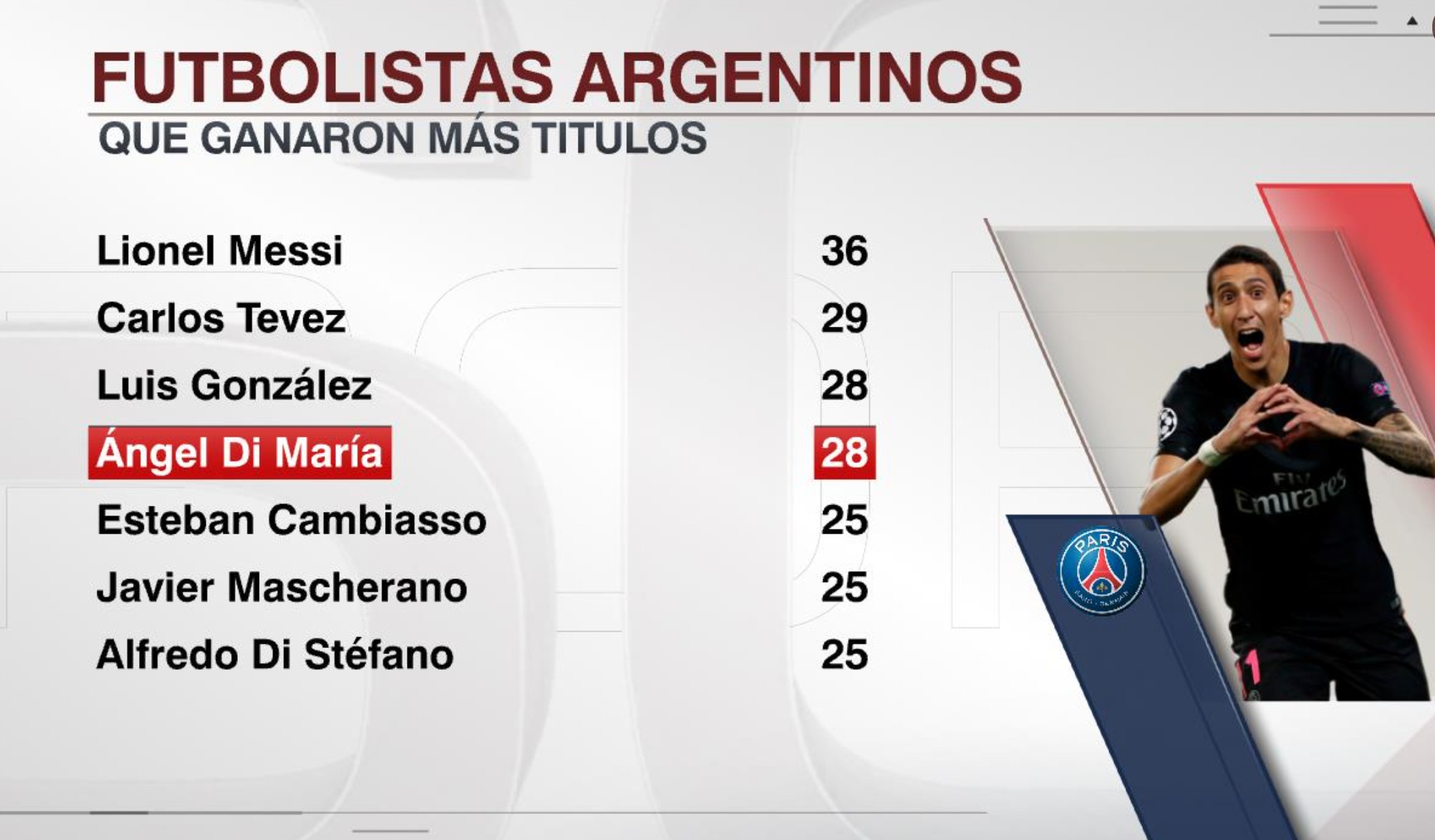据统计,这使得迪马利亚追平卢乔-冈萨雷斯,成为夺冠次数第三多的阿根廷球员,仅次于36次夺冠的梅西和29次夺冠的特维斯。