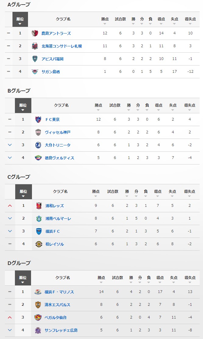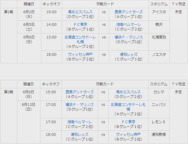 ※备注:第一轮淘汰赛采用主客场两回合制,原则上小组第一的球队先客后主(FC东京由于球场日程安排冲突,将先主后客),晋级的四支球队将对阵本赛季参加亚冠的川崎前锋、大阪钢巴、名古屋鲸鱼和大阪樱花。
