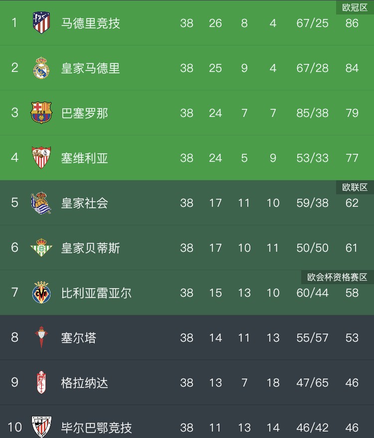 马德里竞技、皇家马德里、巴塞罗那与塞维利亚早早锁定下赛季西甲四个欧冠席位,两个欧联席位则由皇家社会与贝蒂斯获得。此外,位列第七的比利亚雷亚尔获得了参加全新的第三级别欧战“欧会杯”资格赛的机会。
