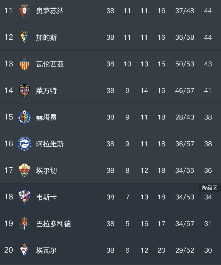 埃瓦尔、巴拉多利德与韦斯卡在本赛季结束后降入西乙,另一方面,西班牙人与马略卡已锁定下赛季的两个西甲名额,最后的一个升级名额则将通过附加赛的形式产生。
