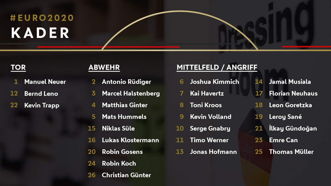 本届欧洲杯,德国队与法国、葡萄牙以及匈牙利组成死亡之组。门将特尔施特根因为受伤无缘本届欧洲杯,另外一名球星罗伊斯则宣布不参加本届欧洲杯。