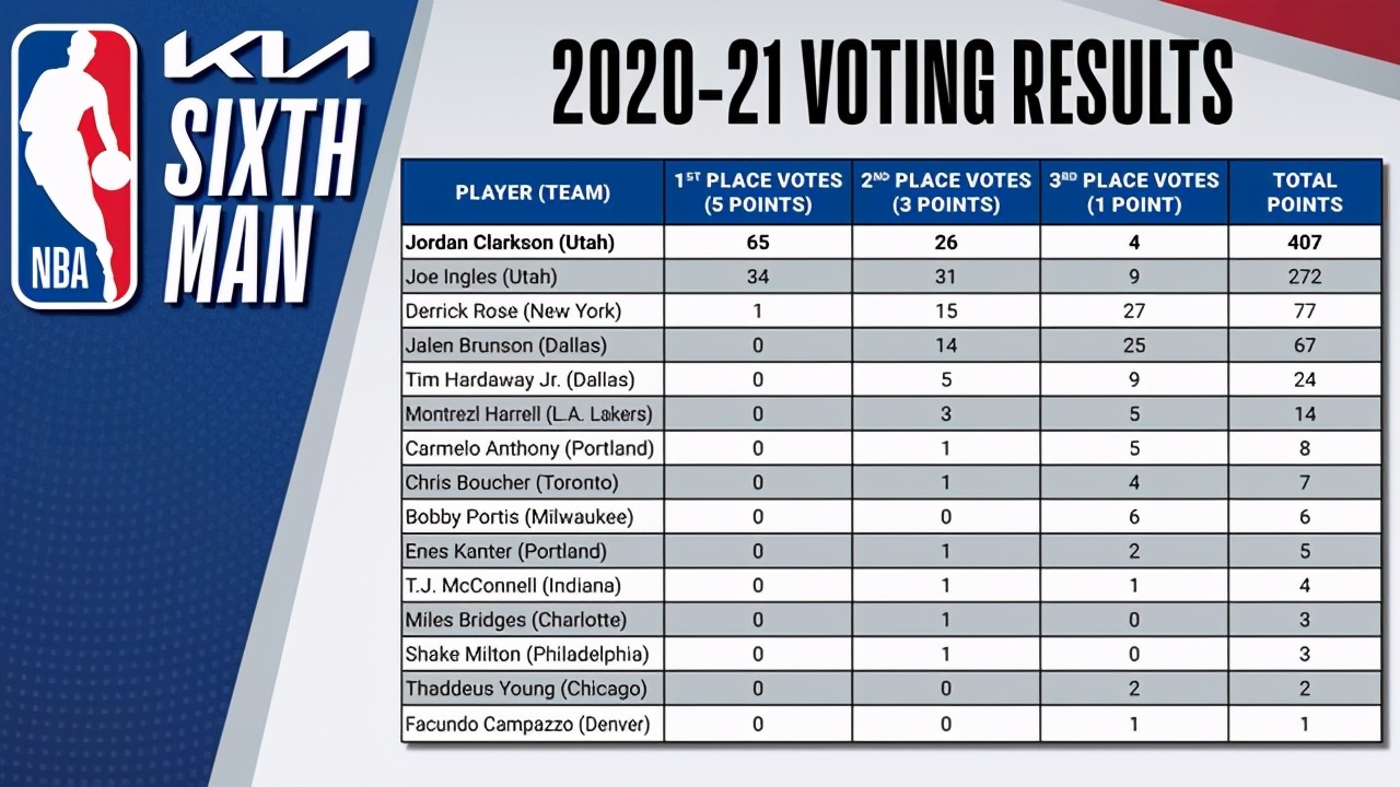 北京时间5月25日,NBA官方宣布了2020-21赛季常规赛最佳第六人得主。爵士队后卫乔丹·克拉克森首次赢得该奖项,同时也是爵士队本赛季第一位获得年度最佳奖项的球员。