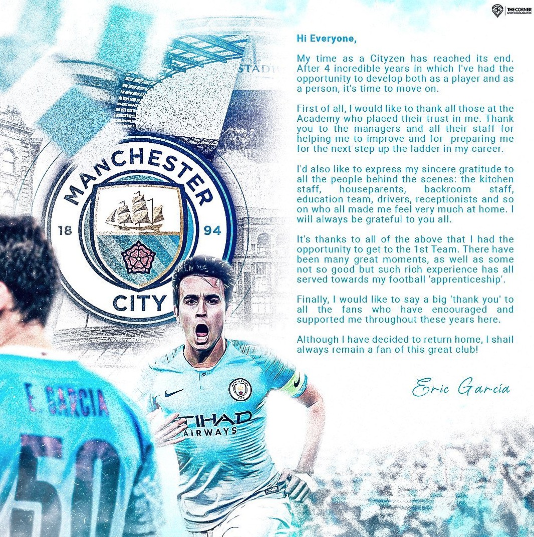 巴萨新援埃里克-加西亚更新了社交媒体,并写了一封信告别曼城。