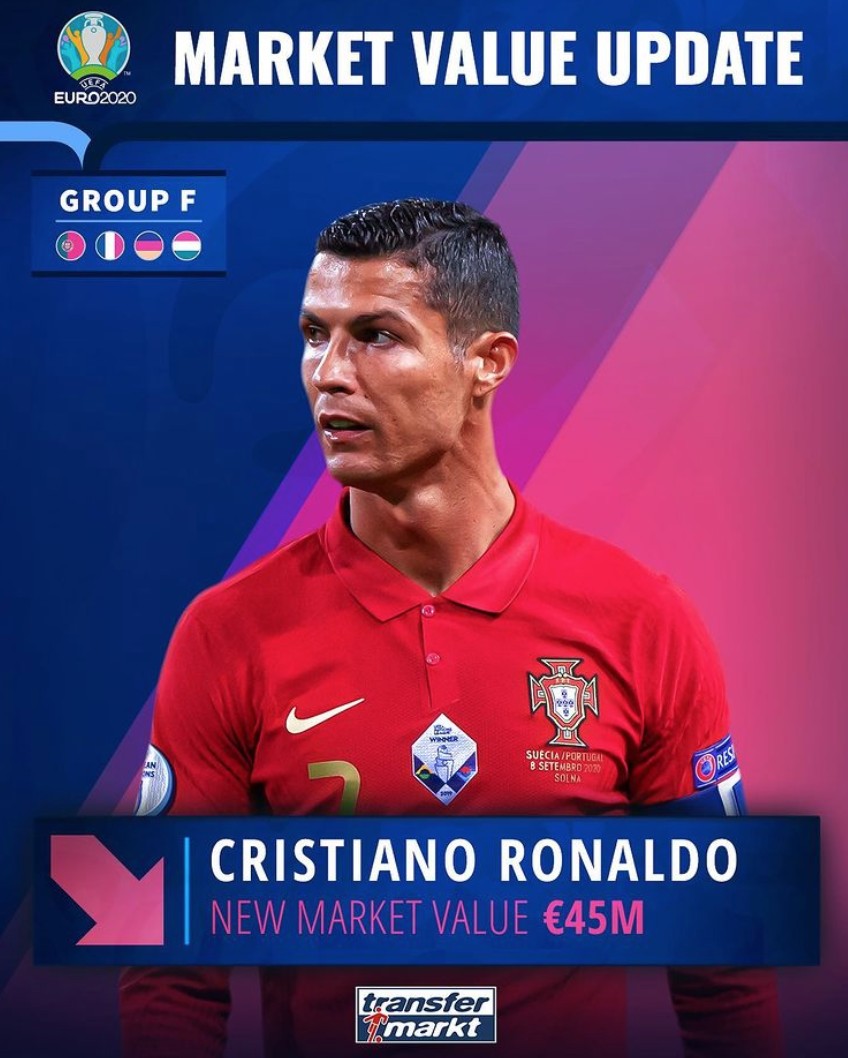 《德国转会市场》更新了C罗的最新身价,下降到了4500万欧元。