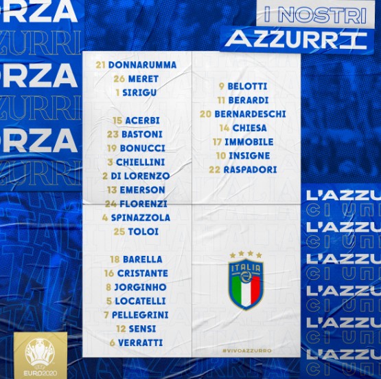 意大利公布了欧洲杯的26人最终名单,其中基耶萨领衔,维拉蒂、森西在列。