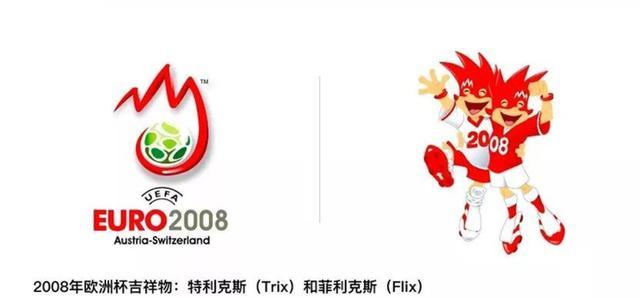2008年欧洲杯由奥地利和瑞士联合承办,这一次的吉祥物来了一个双胞胎组合,穿着一身球衣准备踢球,一个20号,一个08号,意味2008年欧洲杯。