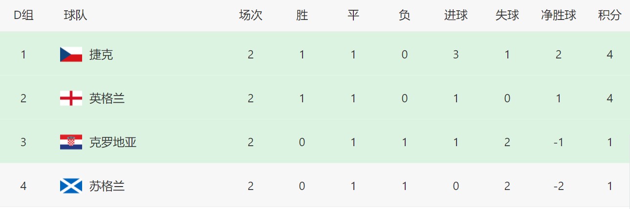 今晚的欧洲杯小组赛将上演D组的收官之战。昨晚B组和C组的比赛结束后,D组的英格兰和捷克已经锁定了欧洲杯16强的两个名额,两队在本轮将上演直接对决。而克罗地亚和苏格兰都还保留着晋级淘汰赛的可能。今晚,D组的四队将为出线名额以及小组排名进行最后的战斗。