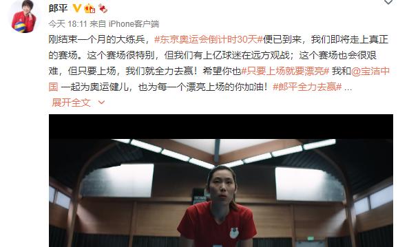 就在今天郎平和朱婷接新代言,其中郎平在社交媒体上发文称:“刚结束一个月的大练兵,东京奥运会倒计时30天便已到来,我们即将走上真正的赛场。这个赛场很特别,但我们有上亿球迷在远方观战;这个赛场也会很艰难,但只要上场,我们就全力去赢!希望你也只要上场就要漂亮,我和宝洁中国一起为奥运健儿,也为每一个漂亮上场的你加油!”
