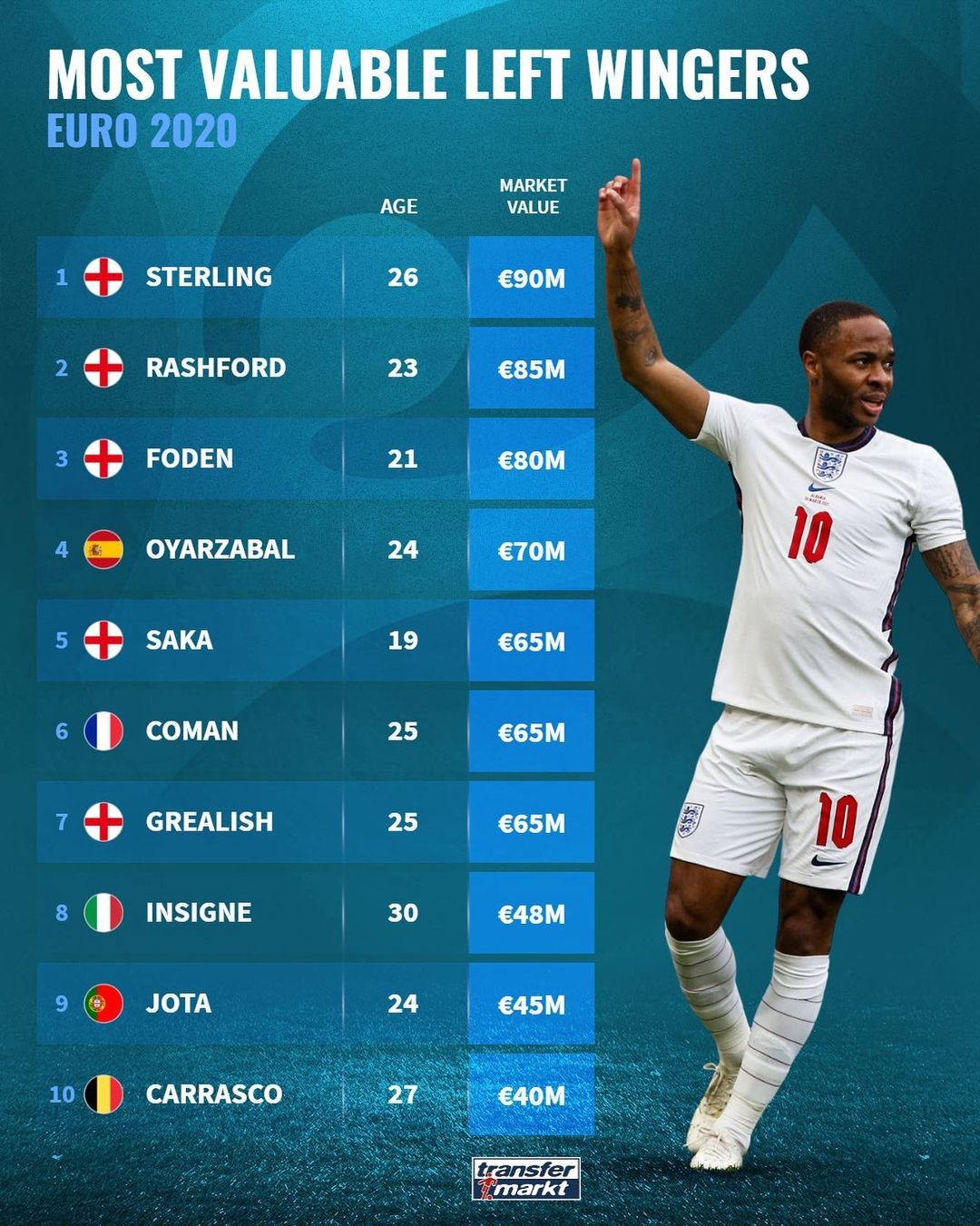 德国转会市场网站盘点了本届欧洲杯左边锋的身价排行榜,斯特林以9000万欧位居榜首,拉什福德和福登也都位列前三。