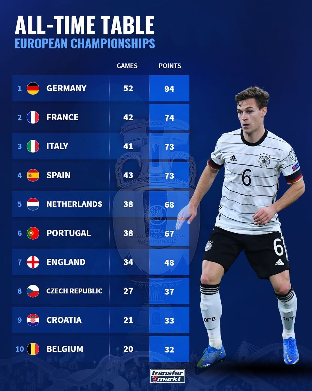 德国转会市场网站统计了欧洲杯历史积分榜,德国队以94分排名榜首,法国队排名第二。