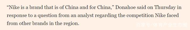 但实际上,「耐克品牌属于中国」这段话,出自多纳霍与华尔街分析师讨论耐克最新盈利报告的电话会议中,是多纳霍对于耐克在大中华地区面临的竞争问题,所作出的一部分回答。他认为,耐克依然是在中国市场占统治地位的运动品牌,并指出,顾客忠诚度是耐克在中国最为宝贵的资产。