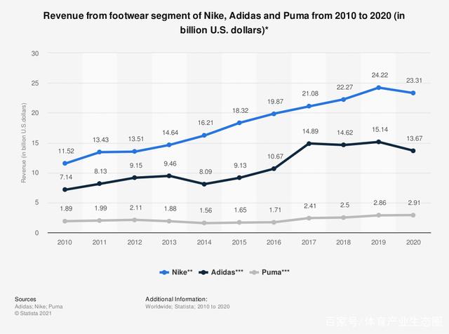 耐克、阿迪达斯及彪马2010-2020年鞋类收入对比 图片来源:Statistica