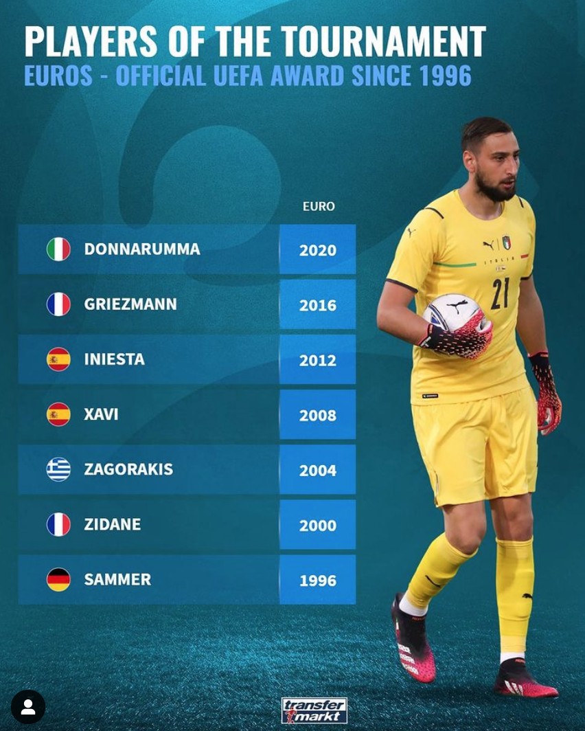 2020欧洲杯落下帷幕,多纳鲁马当选了赛事最佳球员,对此《德国转会市场》盘点了欧洲杯的历届MVP。