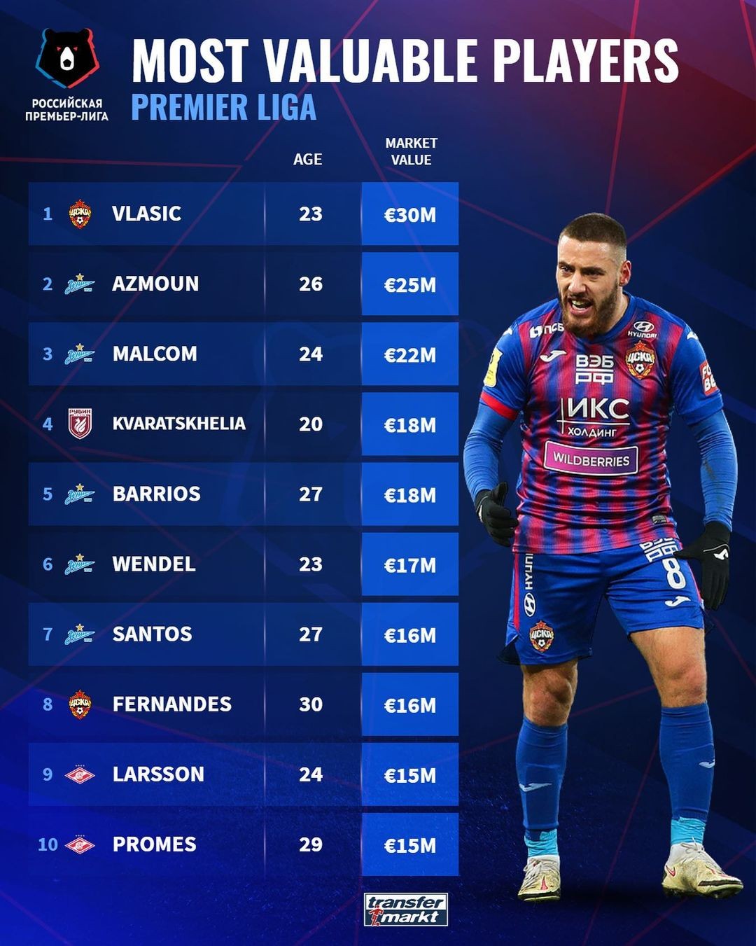 近日,德转更新了俄超球员的身价,莫斯科中央陆军中场弗拉希奇继续以3000万欧排名第一,效力于泽尼特的伊朗前锋阿兹蒙身价上涨至2500万欧,排名俄超第二。