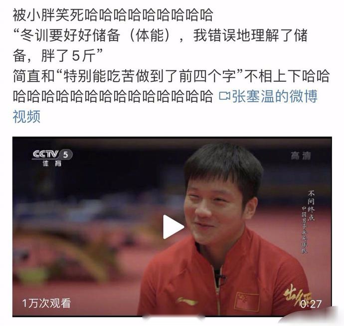 事实上,樊振东也曾自嘲自己“练到胖子的最高境界——肥而不腻”。