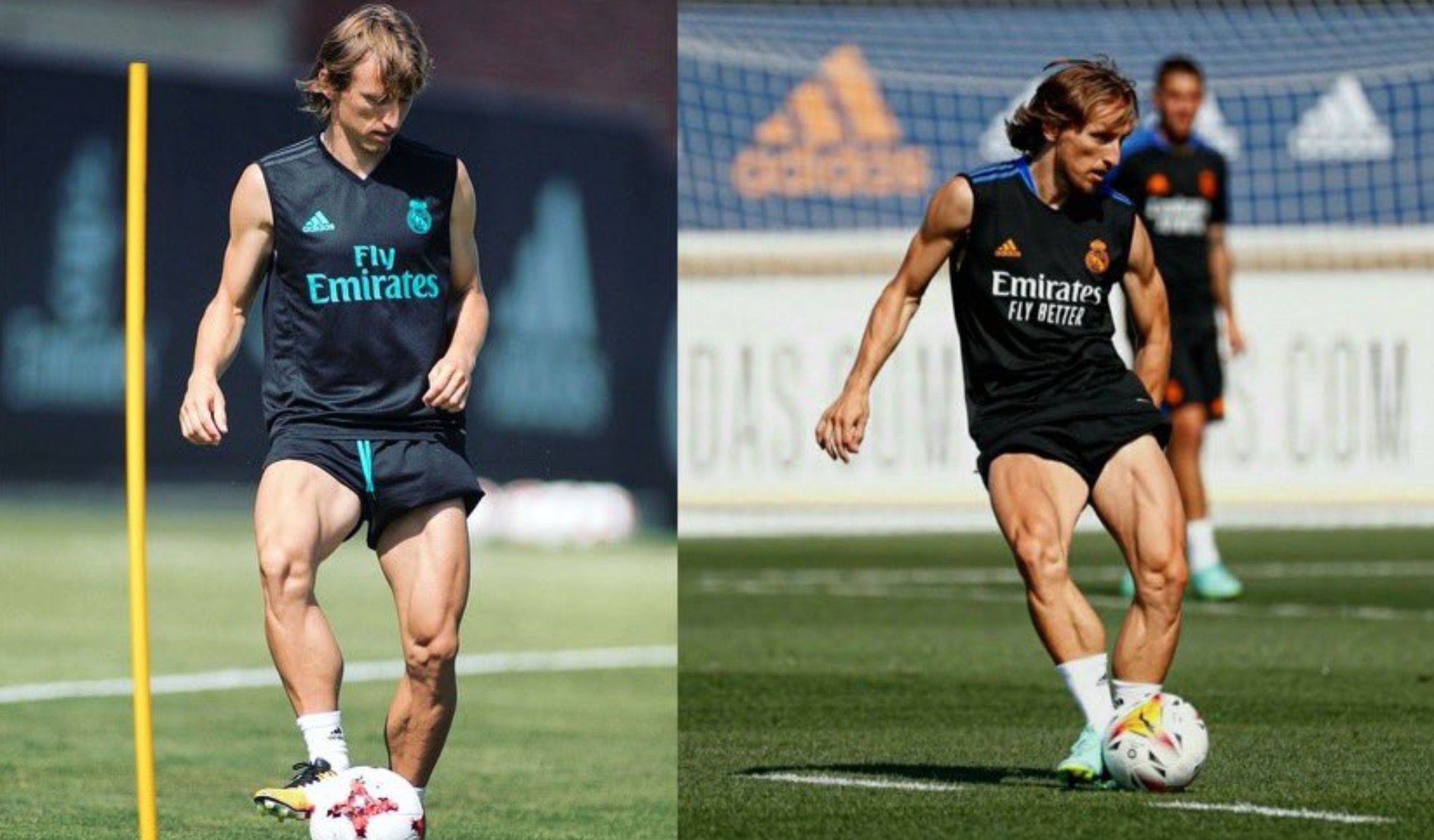 今日,莫德里奇在个人社交媒体晒出自己四年前后的训练对比照,照片中他的动作几乎一样,而35岁的他身体状态看起来也几无变化。