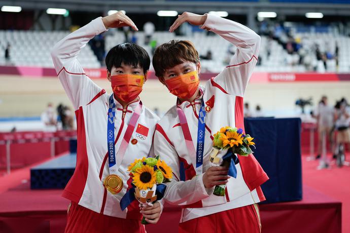 东京奥运会 场地自行车首个比赛日的角逐。佩戴火凤凰头盔的钟天使/鲍珊菊一飞冲天,在女子团体争先赛里(小组赛)打破世界纪录,最终以31.895秒的成绩力压德国队摘得金牌。赛后颁奖时,钟天使/鲍珊菊在领奖服上别上了毛主席像章。