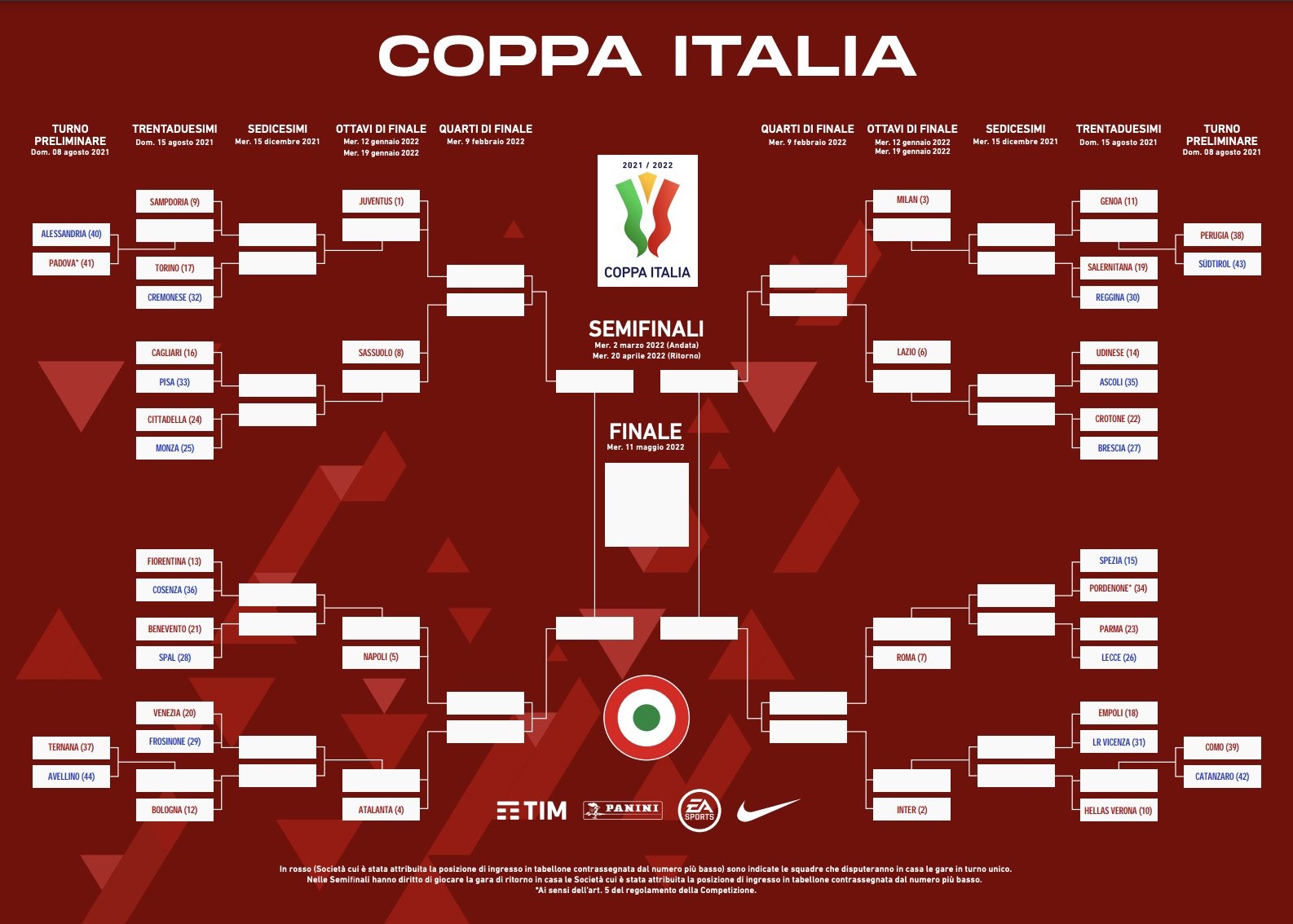 2021/22赛季意大利杯于8月4日进行了抽签,这是首次由44支球队参加比赛,包括意甲和意乙所有球队和4支意丙球队。