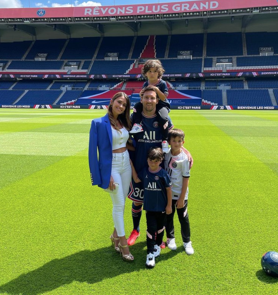 梅西今日在巴黎完成了正式发布会的亮相,安东内拉在社交媒体上晒出了一家五口人的合照。