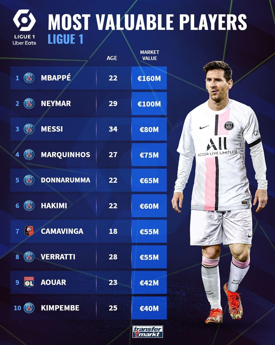 在梅西加盟巴黎后,德国转会市场网站更新了法甲球员的身价排行榜,其中梅西以8000万欧位列第三,前十中巴黎球员占据八席。
