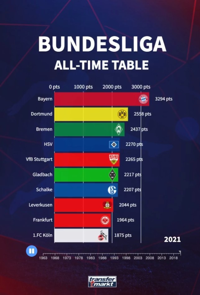 德甲新赛季已经开战,德国媒体“转会市场”统计了德甲球队的历史总积分榜:拜仁慕尼黑高居榜首,遥遥领先;多特蒙德居次席;不莱梅排在第三名。