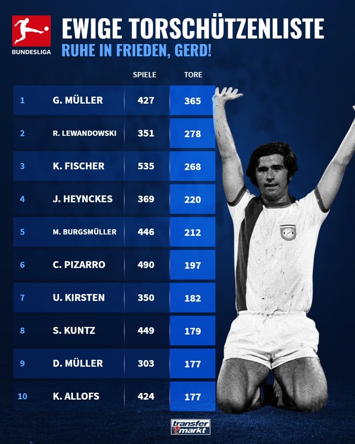 德国转会市场网站列出了德甲联赛历史射手榜,表达对盖德-穆勒的缅怀。