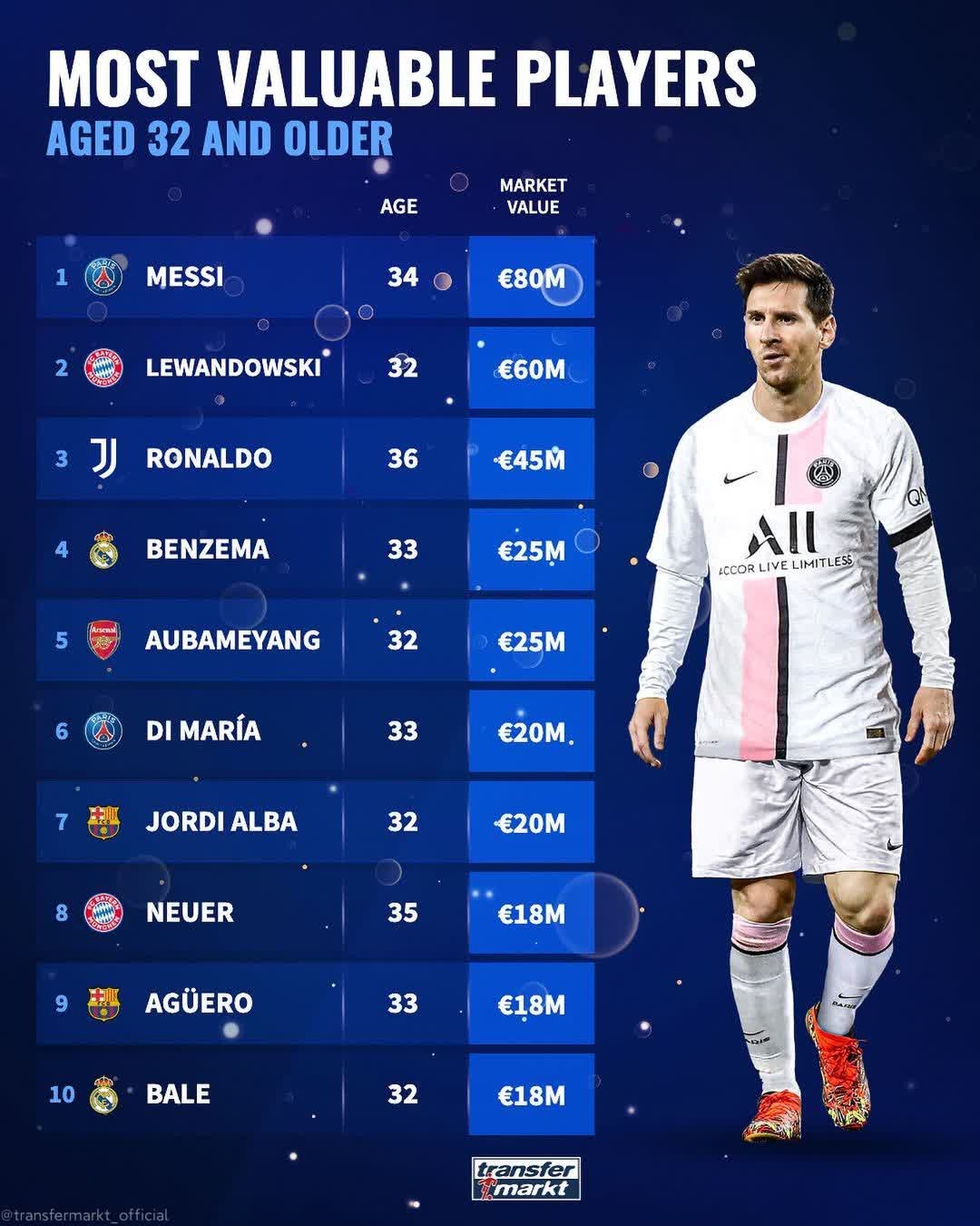 近日,德转盘点了年龄32岁及以上球员的身价,巴黎新援梅西以8000万欧高居榜首,莱万6000万欧次席,C罗4500万欧位列第三。