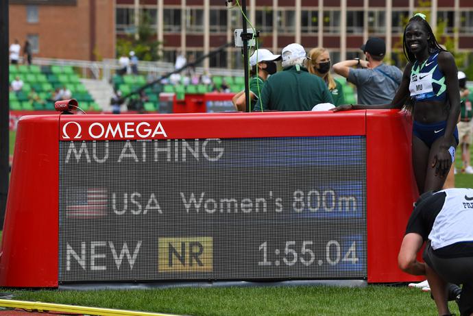 北京时间今日凌晨2021年钻石联赛尤金站第二比赛日的比赛正式开赛,女子800米比赛中,东京奥运会女子800米冠军得主阿辛·穆以1分55秒04的成绩夺冠,刷新了自己保持的美国国家纪录,而这一成绩,也快于她在奥运会的夺冠成绩1分55秒21。