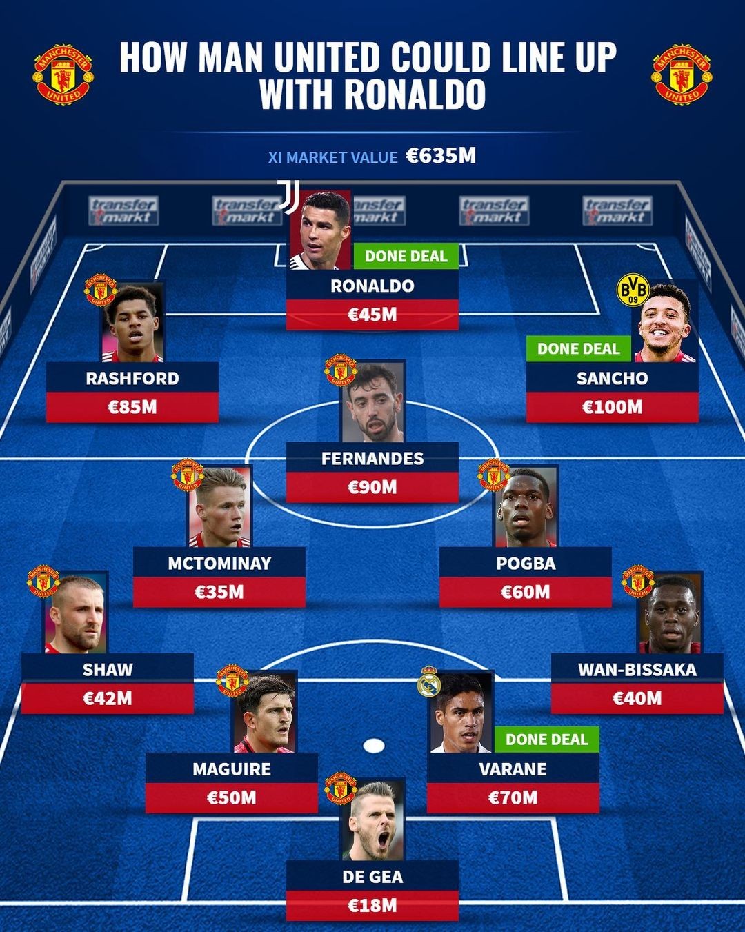 在C罗回归曼联后,德国转会市场预测了曼联的首发阵容,C罗领衔,搭档拉什福德和桑乔。