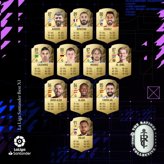 FIFA 22公布了西甲球员能力值最高的11人阵容,皇马6人、巴萨3人、马竞2人。