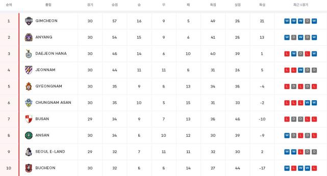 韩国当地时间9月18~19日,2021赛季韩国足球K2联赛第30轮展开争夺,本轮是两天进行。五场比赛中,出现了16粒进球,积分榜前两位的金泉尚武和FC安养在客场均奏凯,继续领跑积分榜。而本轮刚刚换帅的安山Greeners终于取胜,结束了自己九轮不胜的尴尬。下面我们就来看各场比赛的情况: