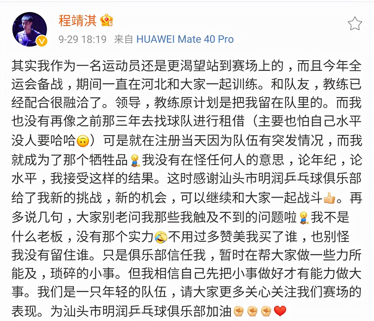 本届全运会,梁靖崑率领河北队获得乒乓球男团季军,队内的程靖淇也随队夺铜。赛后,程靖淇宣布退役:“我坚信运动员的经历会让我受益一生,相信这不是我的终点,只是我未来人生道路上的起点。”这位27岁的边缘国手,就此宣布告别运动员生涯。