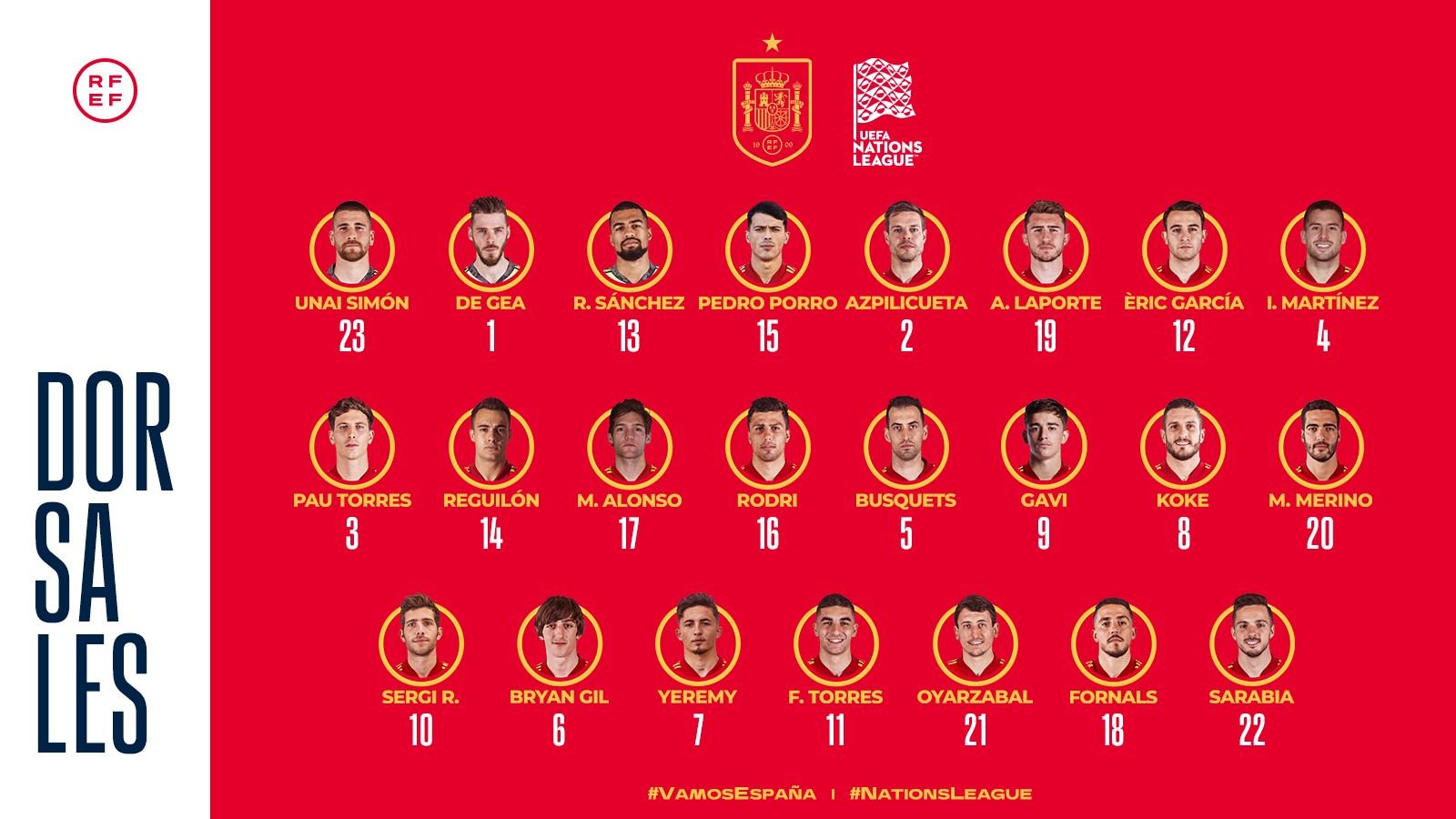 西班牙国家队公布了备战欧国联球员的球衣号码,其中罗贝托获得了10号,首次入选国家队的巴萨小将加维拿到了9号。此外,身披此前拉莫斯15号球衣的是右后卫波罗。
